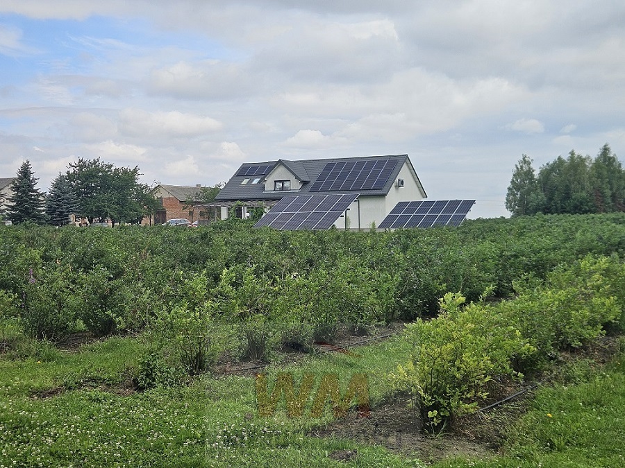 Dom o powierzchni 128,62m2. Na parterze (70,01 m2) znajduje się salon (28,93 m2), gabinet, kuchnia, łazienka, hall i korytarz na piętrze (58,61 m2)- salonik, łazienka i 3 sypialnie. We wspólnej bryle domu znajduje się pomieszczenie chłodni (pojemność ok 150m) i pakowalni owoców (38 m2). Dom i chłodnia wyposażone są w instalację fotowoltaiczną o mocy 20kW, w tym 10kW zainstalowano na dachu i 10kW na gruncie. W domu jest woda, kanalizacja, internet swiatłowód i prąd 230 i 400V.
